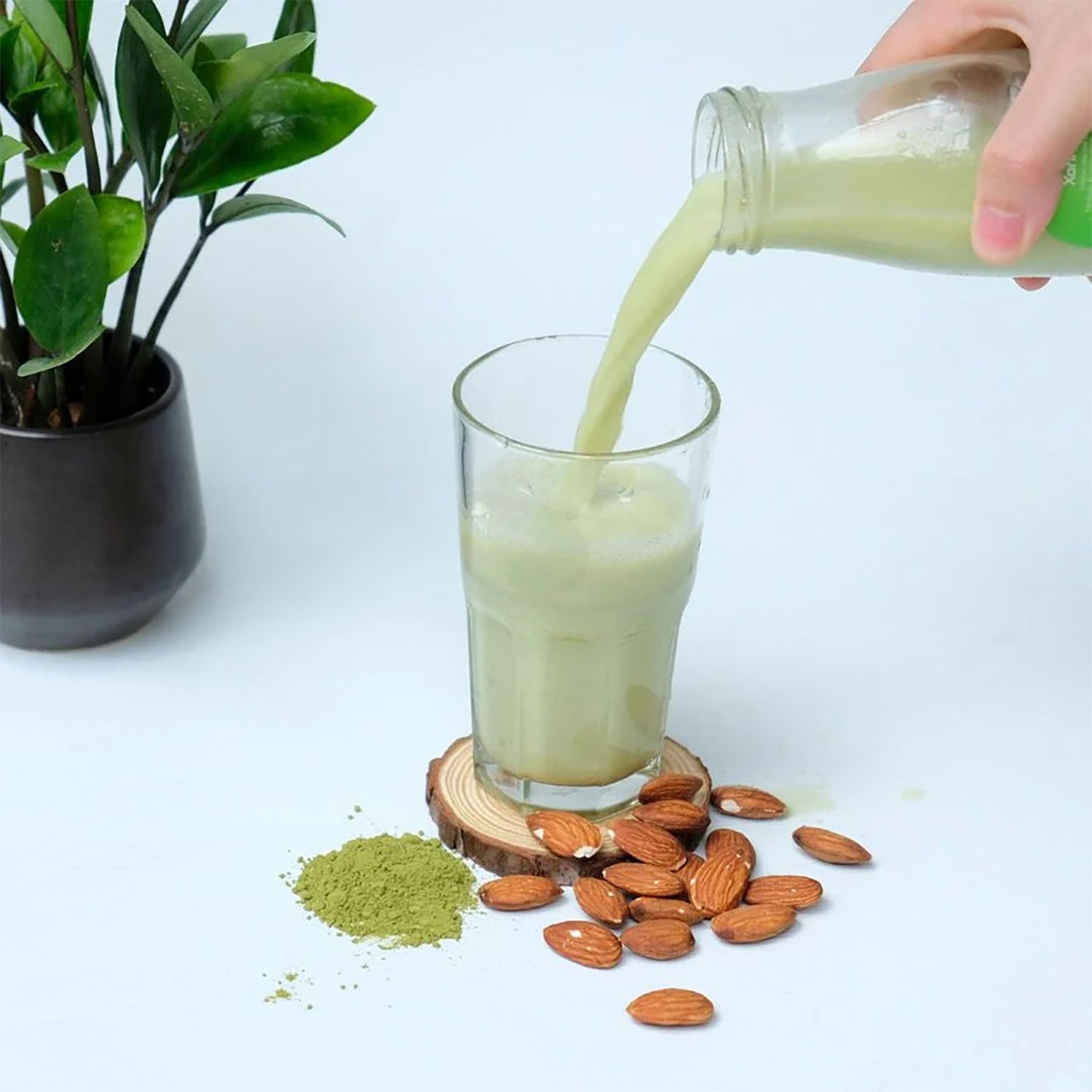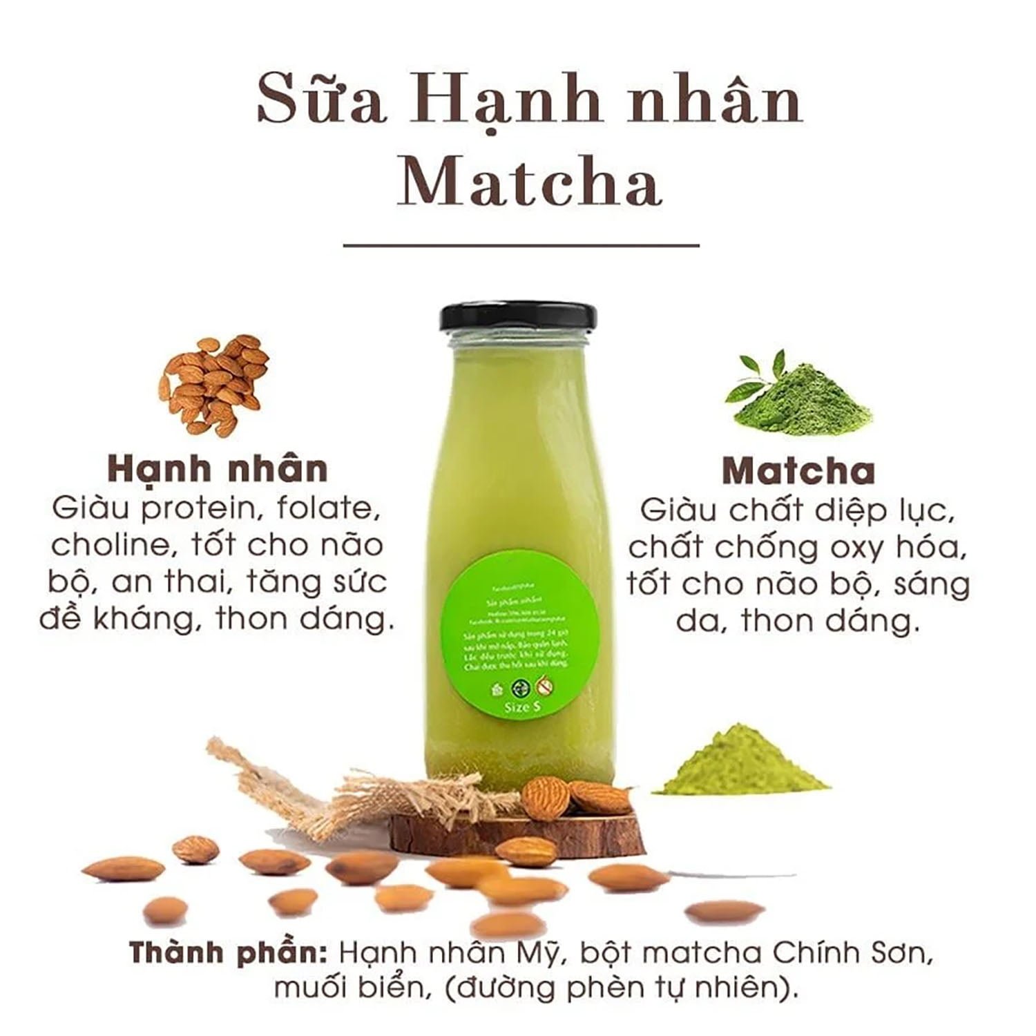 Sữa hạnh nhân matcha được làm từ hạt hạnh nhân và bột matcha, cả hai đều chứa nhiều chất dinh dưỡng, phù hợp cho mọi lứa tuổi.